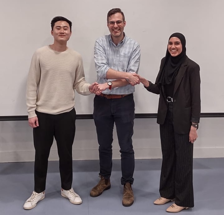 April 2025 Aaliya and William both successfully defend their MSc theses! Congratulations to them both! Aaliya’s work focused on developing a new method for competitive electrochemical assays and William sought to improve sample preparation for microplastics analysis. Way to go both!!!